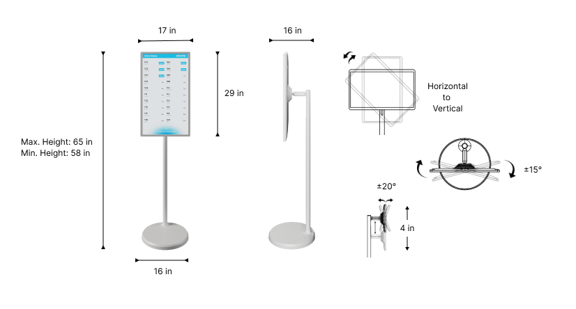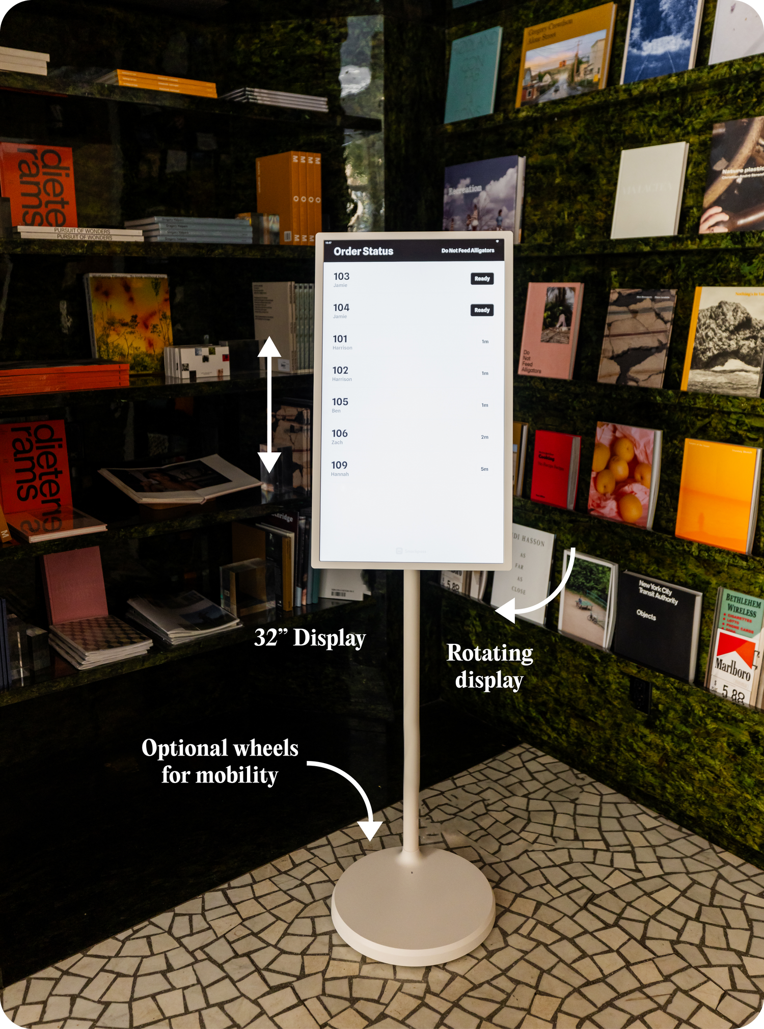 The Customer Pickup Screen provides real time updates to customer's orders on a 32" display. Equipped with optional wheels for mobility and adjustable screen height the Customer Pickup Screen fits seamlessly into any restaurant scene.