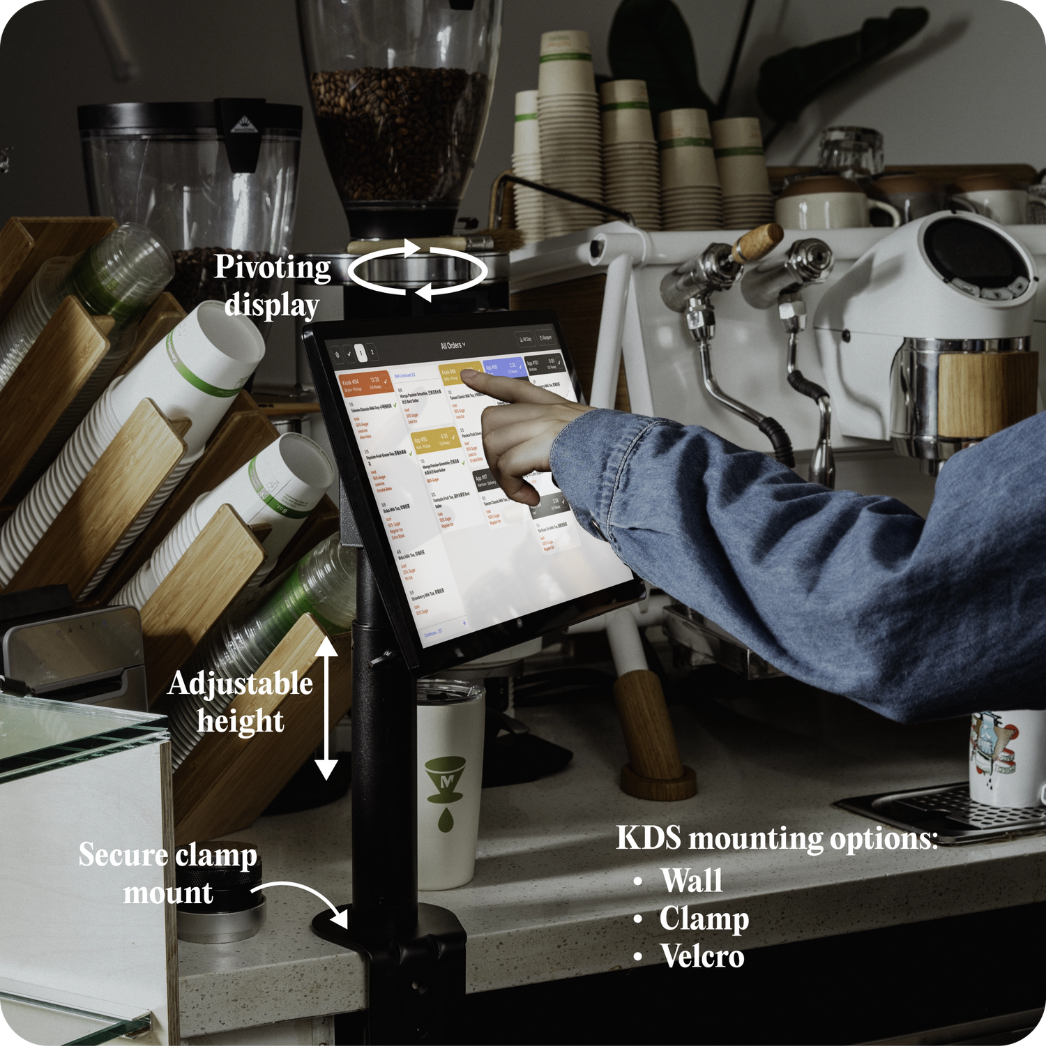 A solution designed to revolutionize kitchen operations with its two mounting options – clamp and wall mounts, color-coordinated order management, and real-time communication of preparation status. With the KDS, you can optimize efficiency, minimize errors, and enhance communication in your kitchen environment.